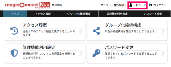 マジックコネクト・ネオ 管理機能 に アカウント管理者 のユーザ名とパスワードでログインします。