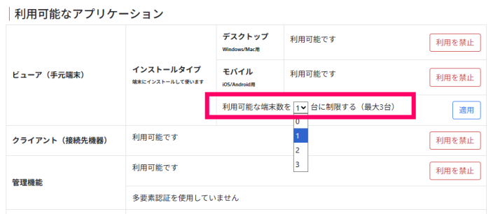 [3.3. 利用可能なアプリケーションと台数を変更する] をご確認ください。