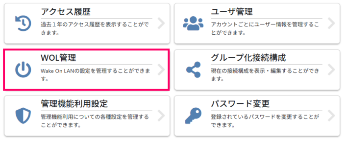 メニュー一覧から「WOL管理」を選択します。