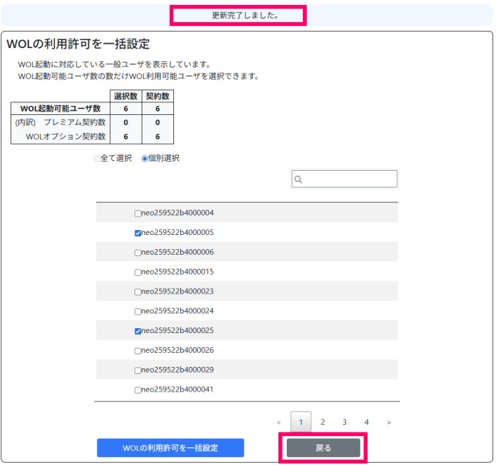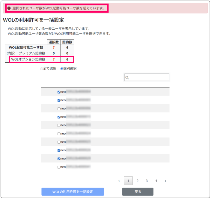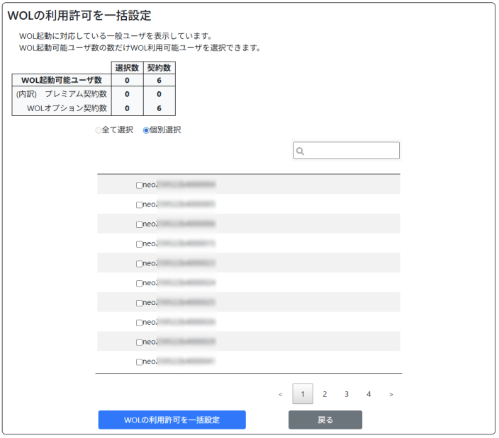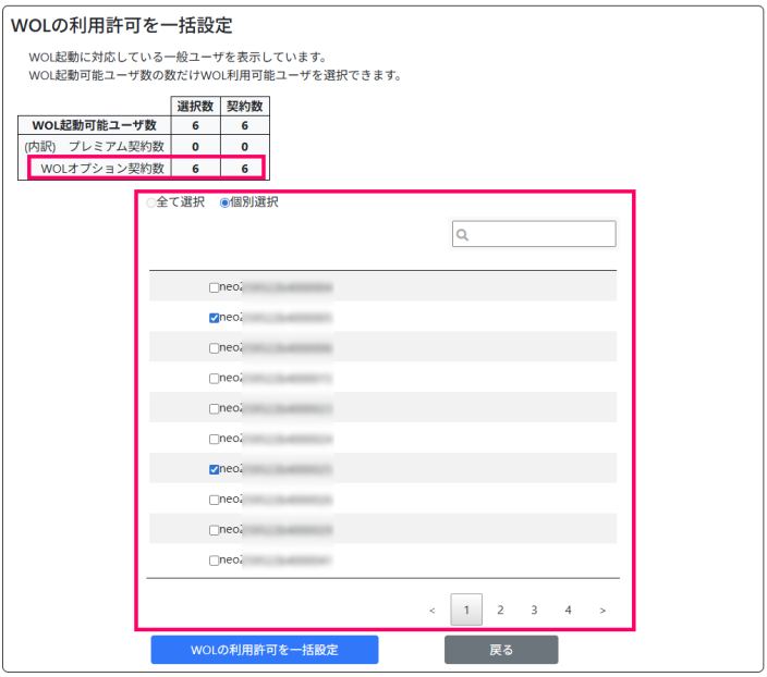(チェックボックスが ON のアカウントの数に応じて「WOLオプション契約数」行の「選択数」が変化します。)
