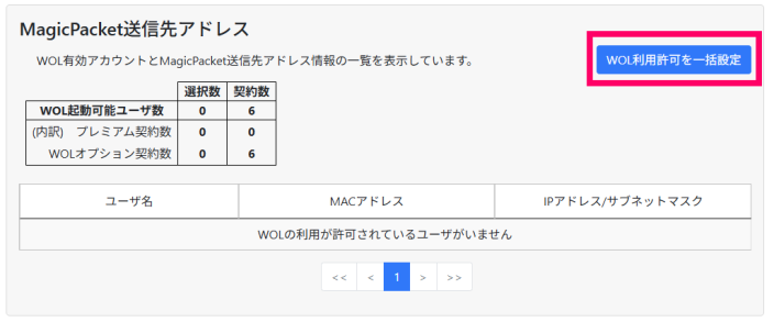 この例では、「WOLオプション」を6個契約し、まだ管理機能で許可操作をしていません。