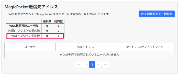 「契約数」が管理機能でWOLオプション機能を許可できるアカウントの最大数です。