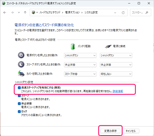 [高速スタートアップを有効にする(推奨)]のチェックを外し、「変更の保存」をクリックします。