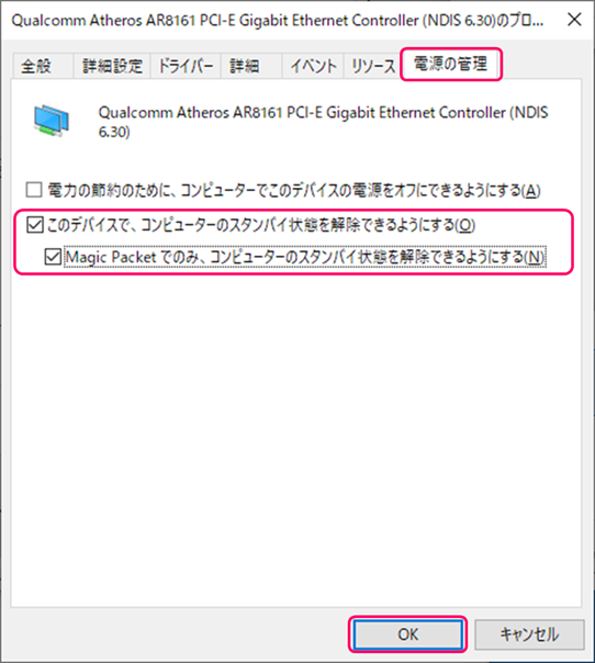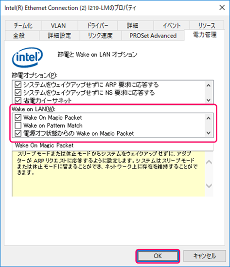 [Wake on LAN]内の設定を、下記の通りチェックします。