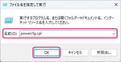 「powercfg.cpl」を入力し、「OK」をクリックします。