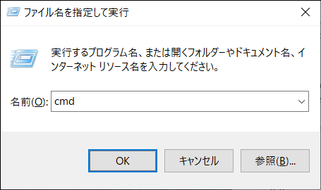 2. [名前:]に「cmd」と入力し、「OK」をクリックしコマンドプロンプトを表示します。