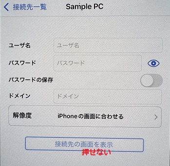 最新バージョンでは、Windowsユーザー名を未入力のまま「接続先の画面を表示」ボタンを押せるようになりました。(iOS版 Ver9.1r2、Android版 Ver9.1r1 より前の挙動に戻りました。)