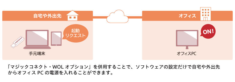 ソフトウェアの設定のみで、自宅などからオフィスPCの電源を投入できるオプションサービスです。起動したいPCの台数分、ご契約いただくことで利用可能になります。